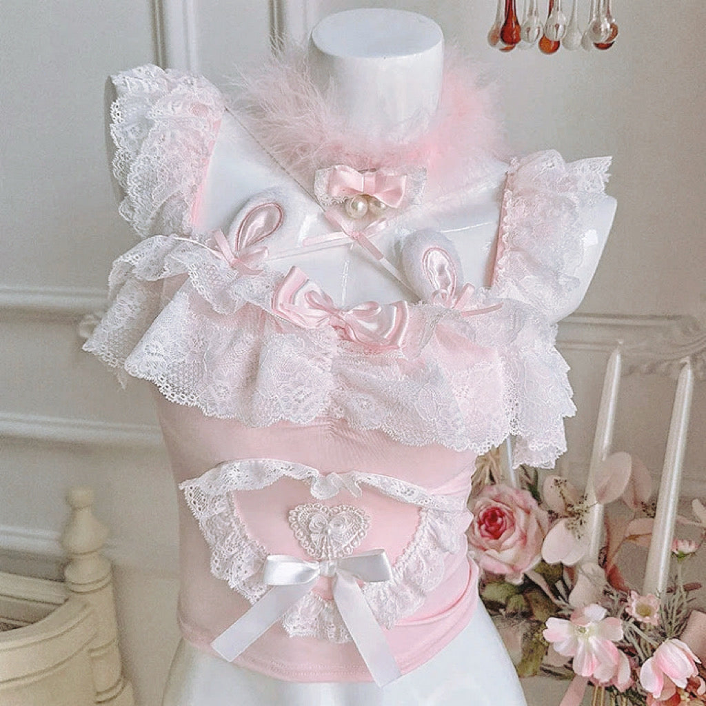 Wonder-hop Pink Coquette Bustier Top with Bunny Ears and Lace Ruffles