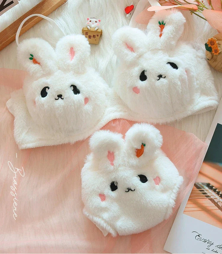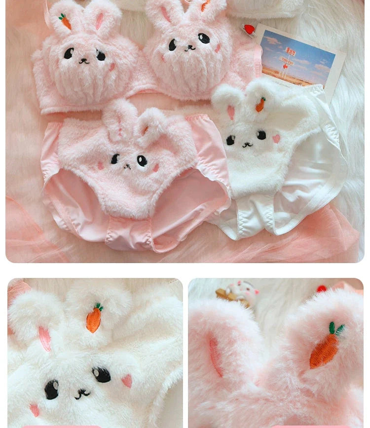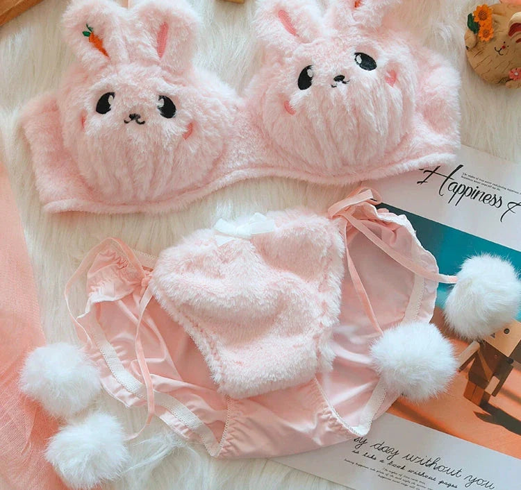 Bunny Plushie Kawaii Lingerie 2-piece Set in two different styles: with pompom decorated bottoms or with bunny ears. Bra has removable padded inserts.