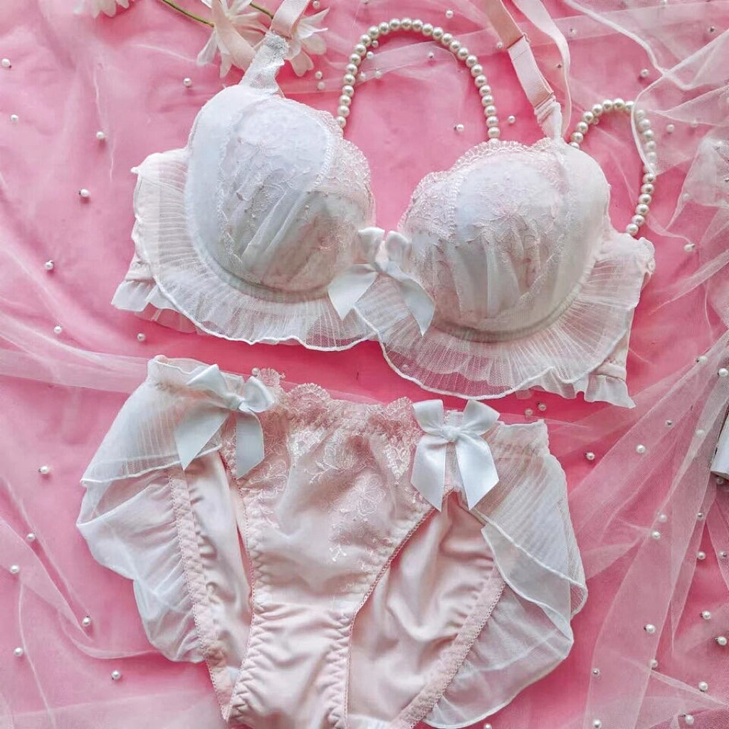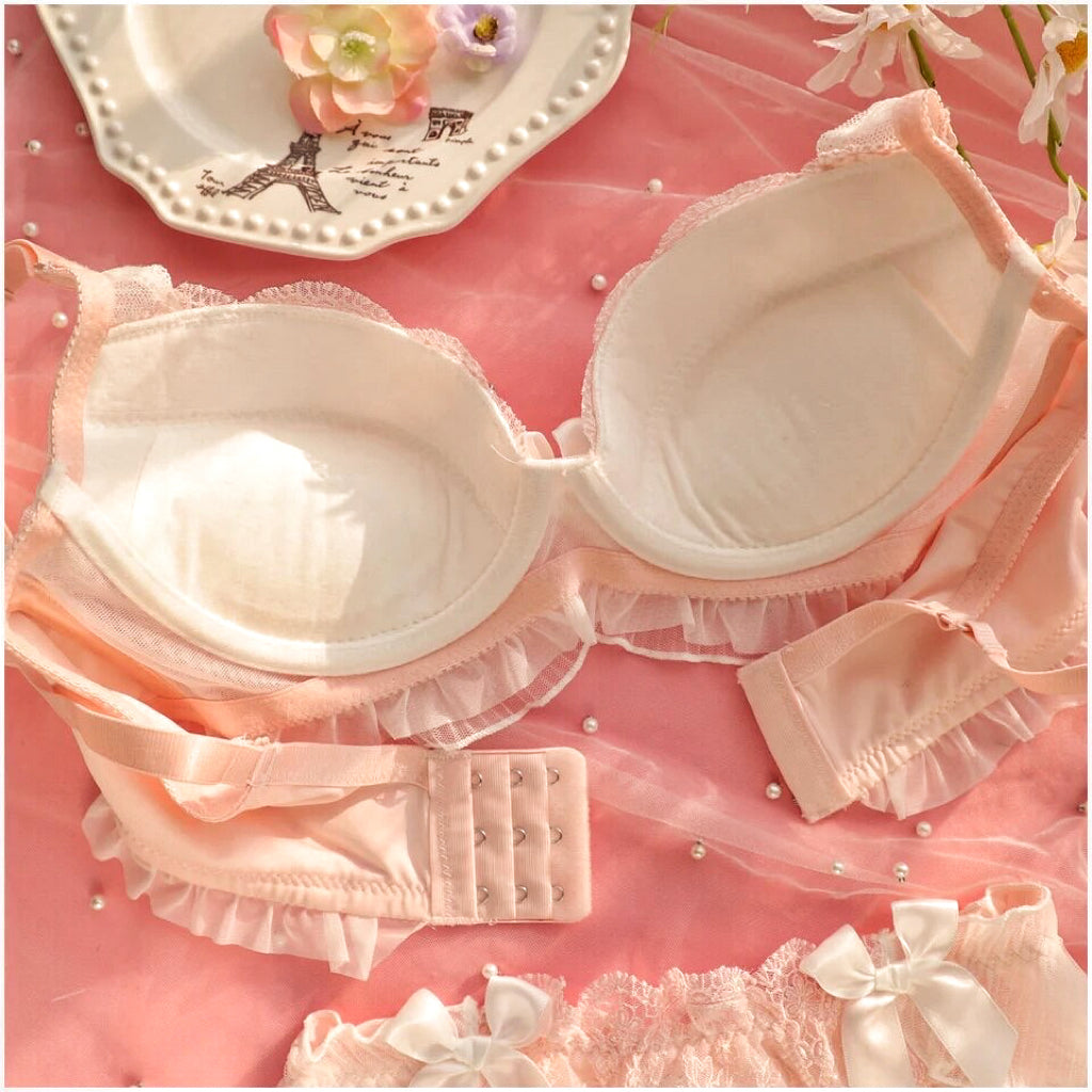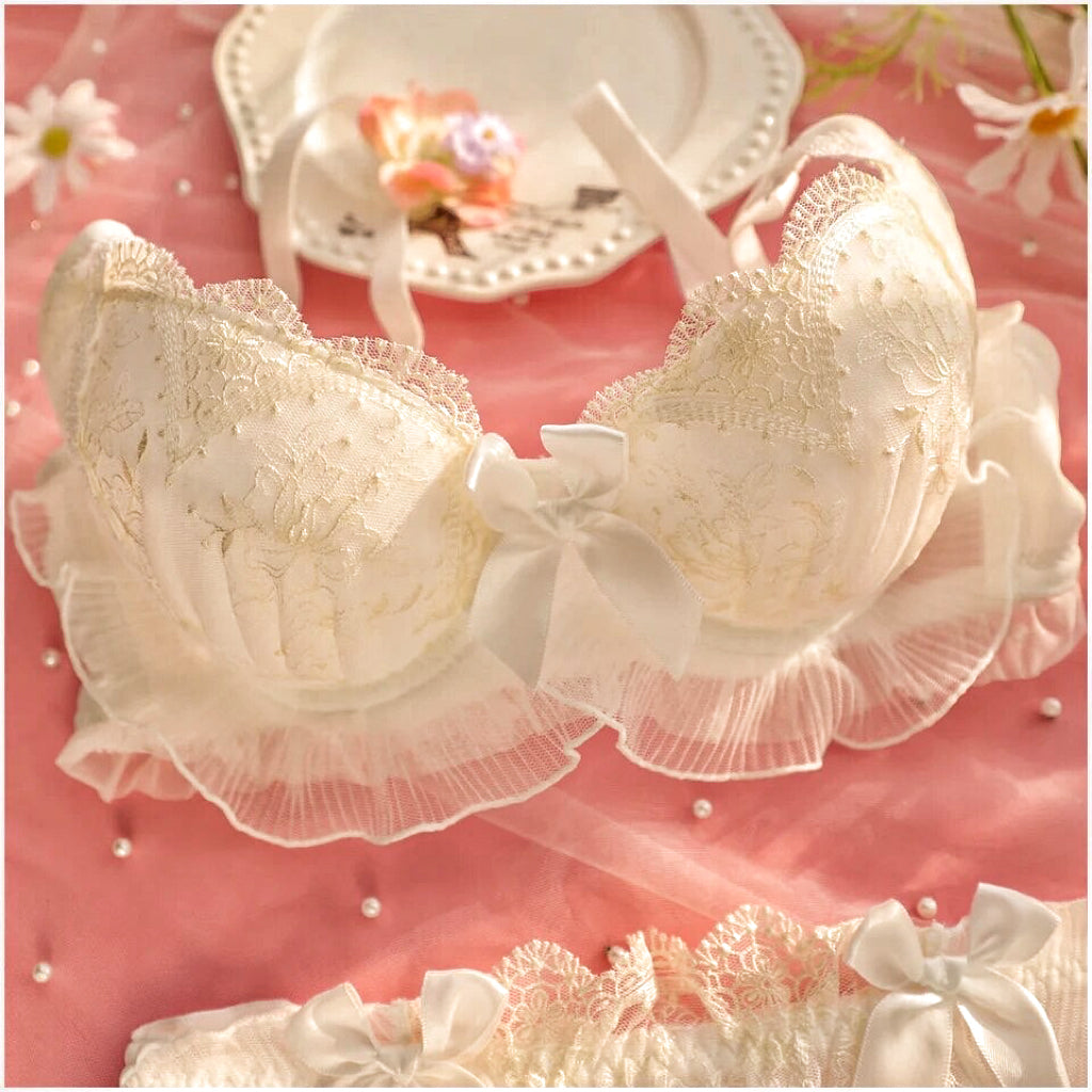 Girly Romantic Royalcore Princess Lingerie Set featuring lace bra with bows, removable padded inserts, lace ruffles and matching lace bottoms with bows.