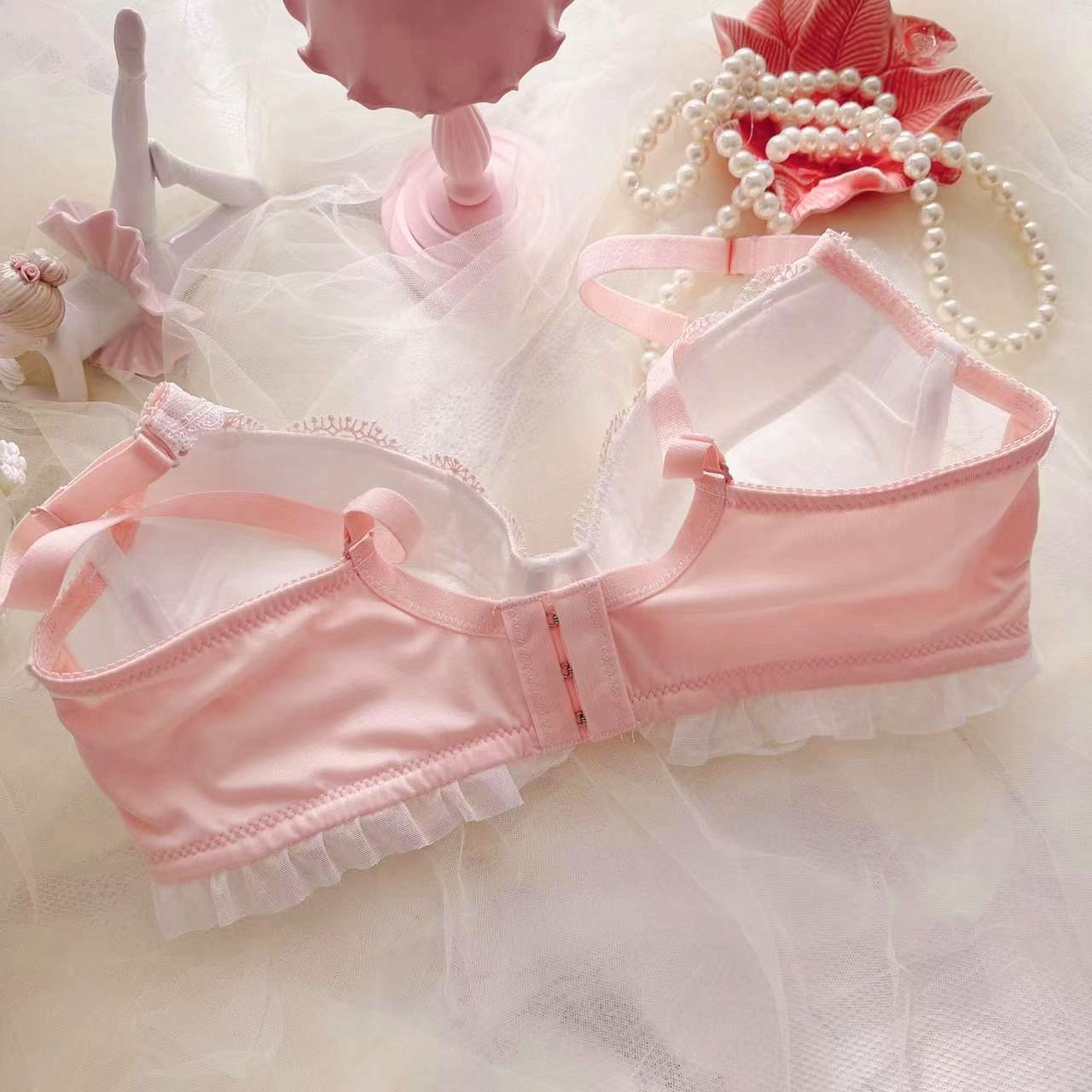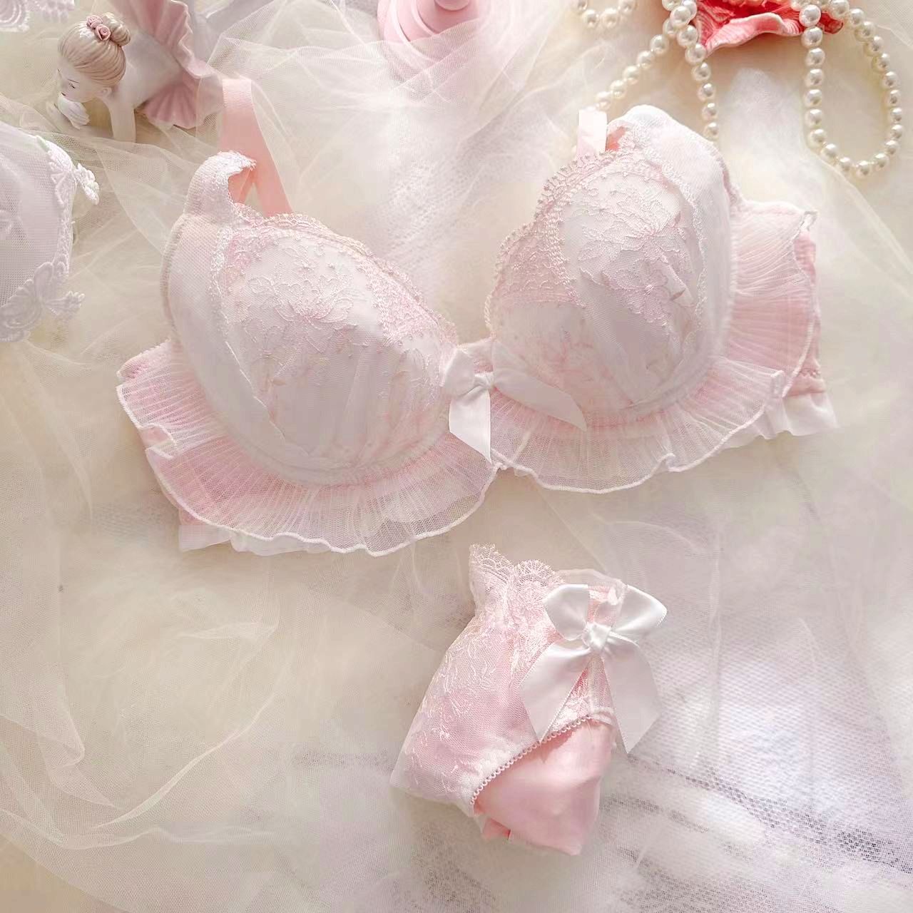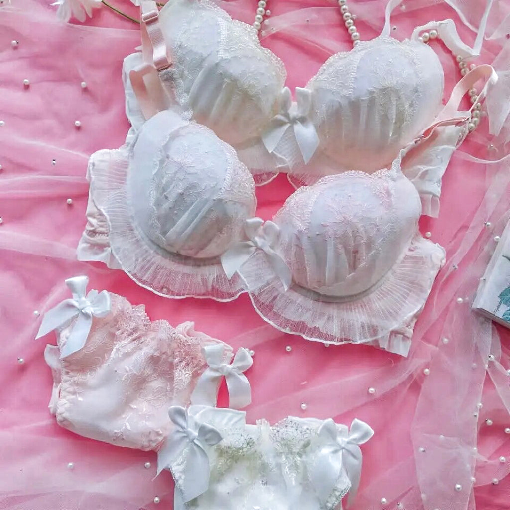 Girly Romantic Royalcore Princess Lingerie Set featuring lace bra with bows, removable padded inserts, lace ruffles and matching lace bottoms with bows.