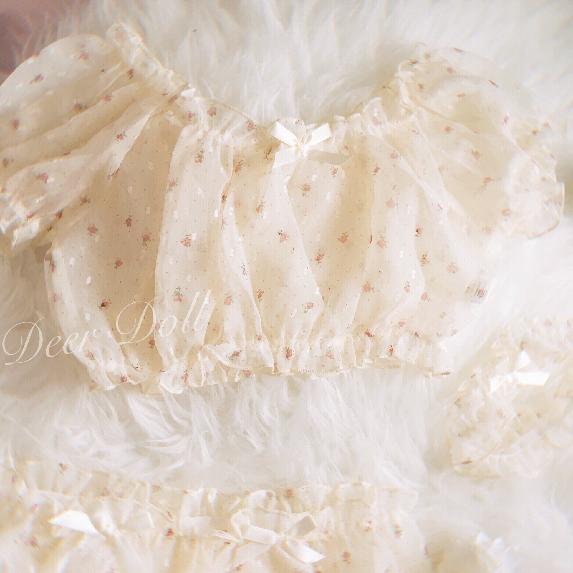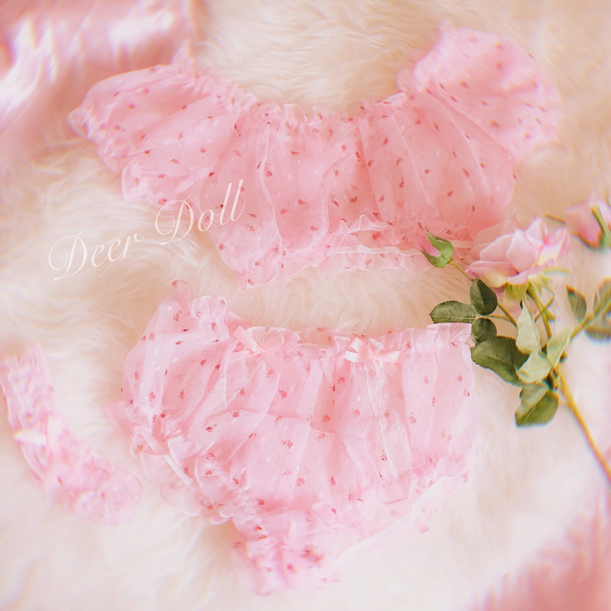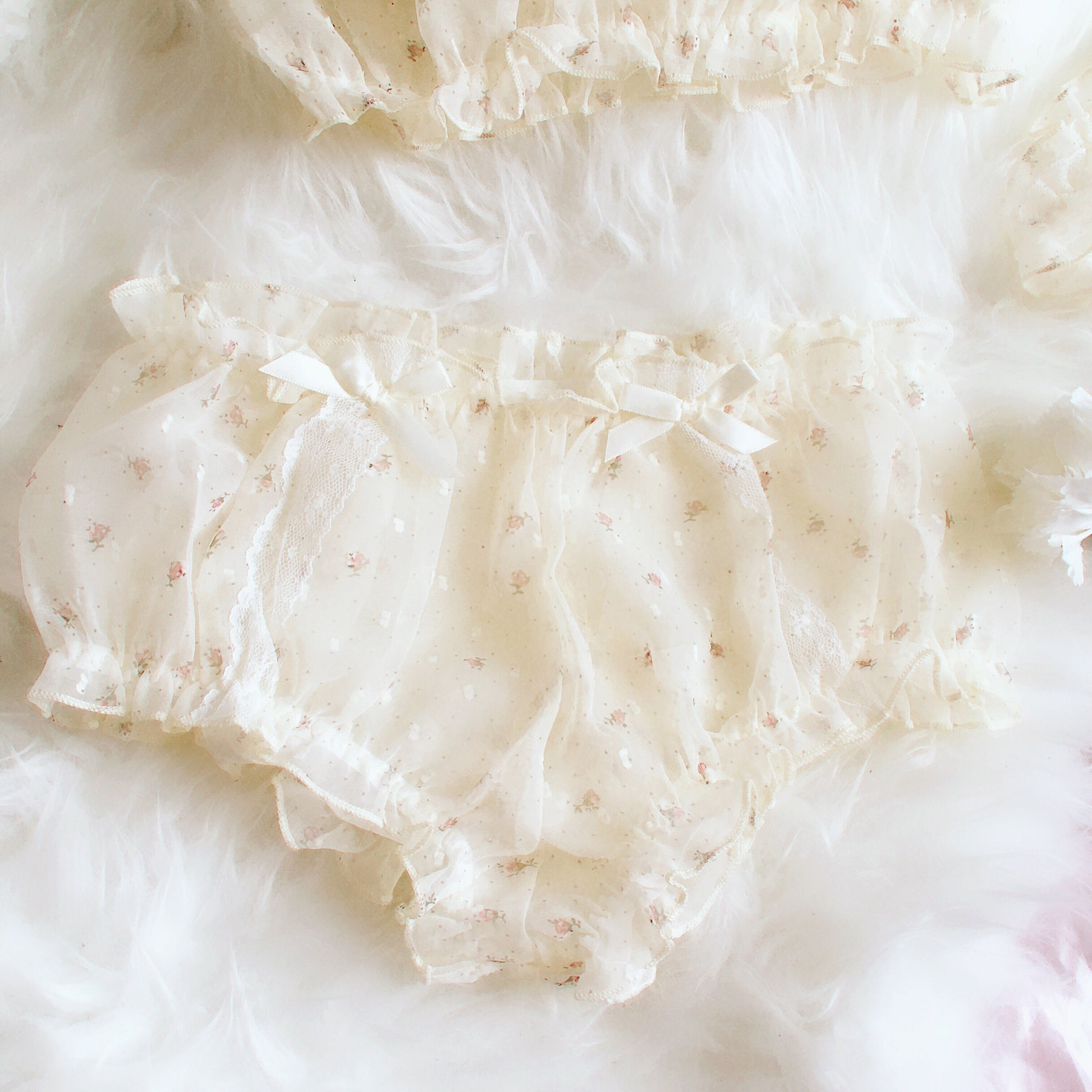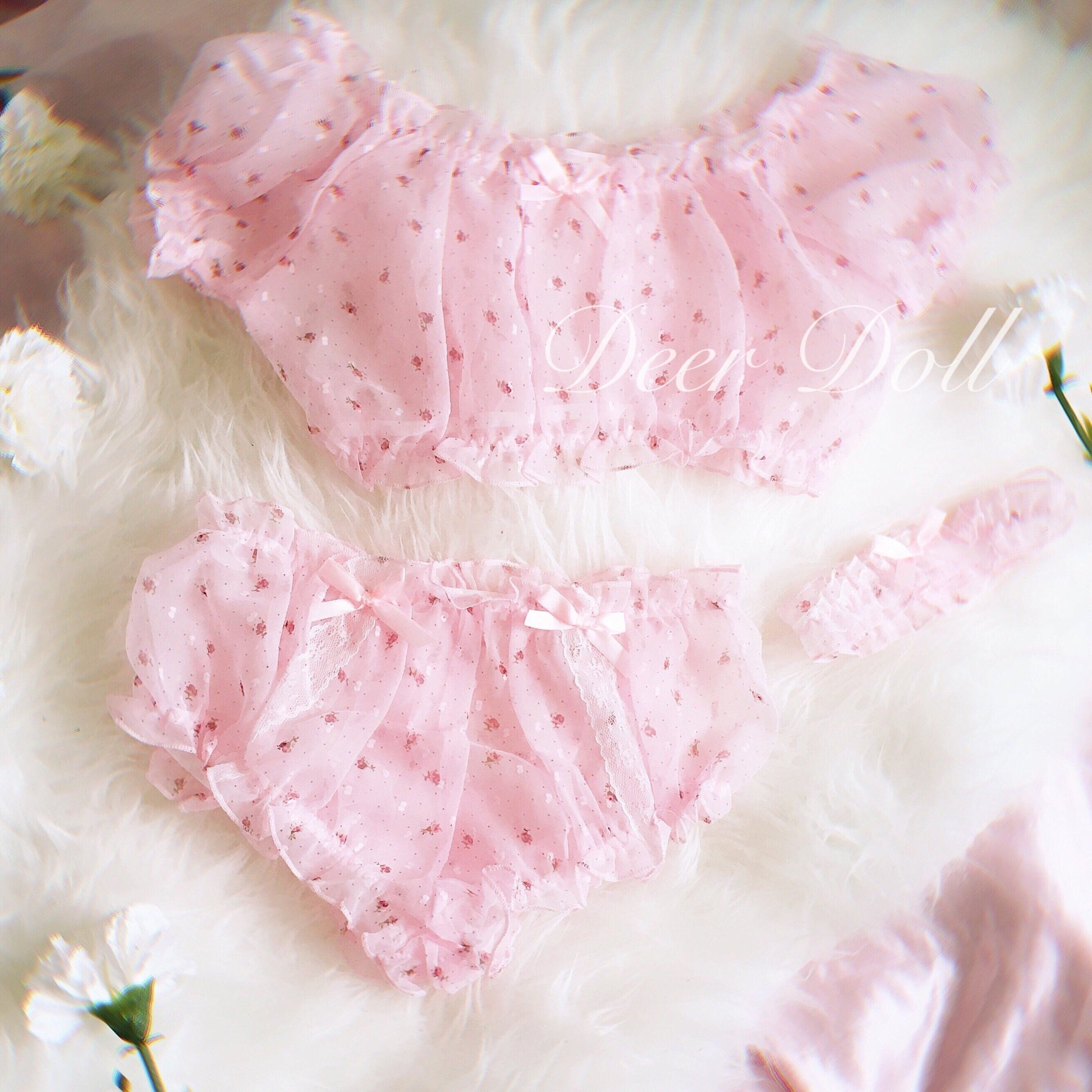 Dreamy 3-piece sleep/pj/lingerie set with ditsy floral print featuring bottoms with lace and bow decoration, a crop top with short sleeve and a matching garter. Elastic waist. The fabric is semi sheer.