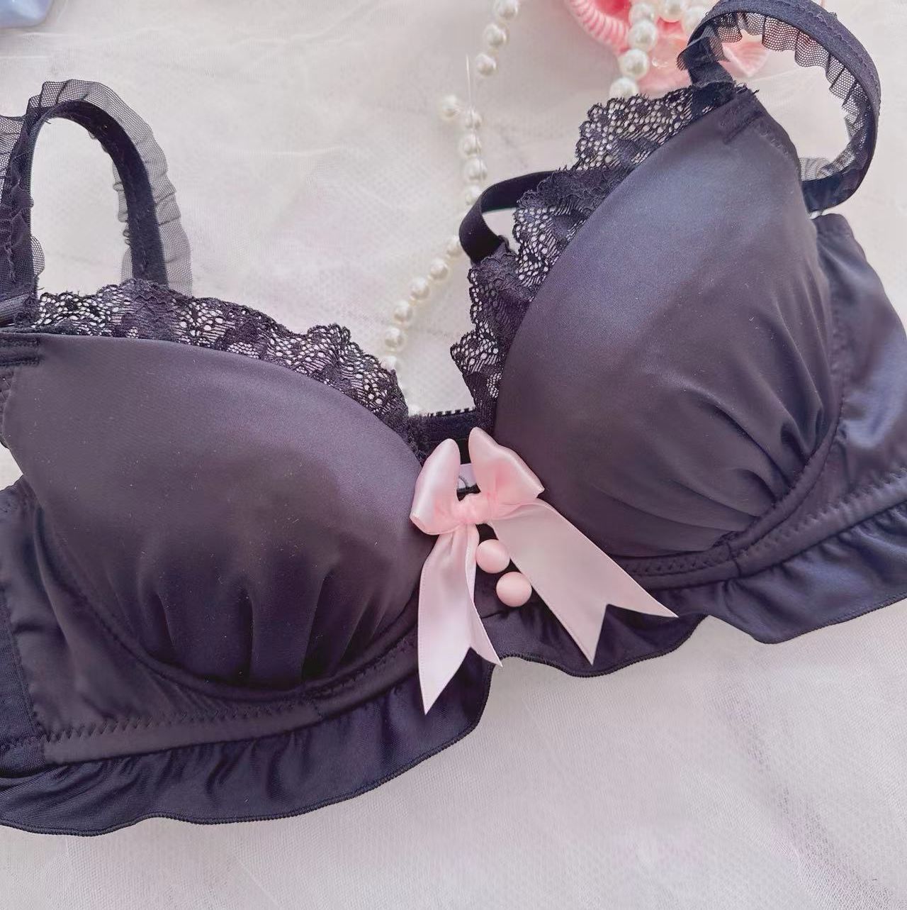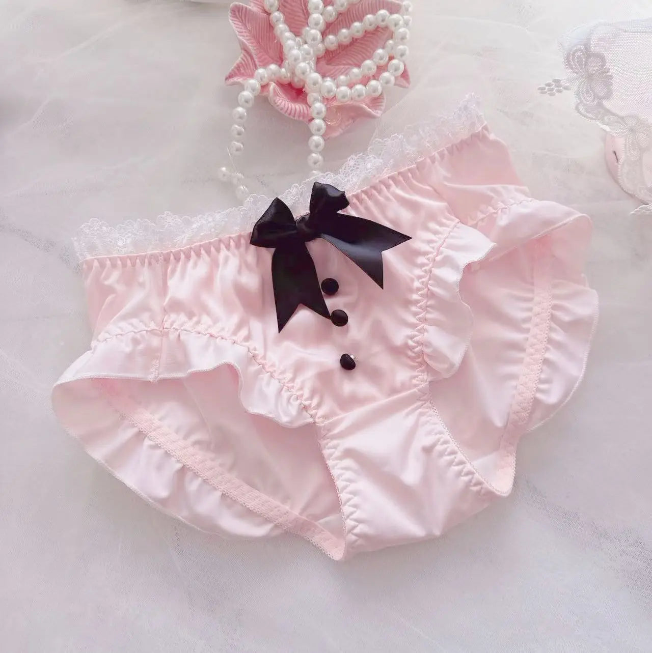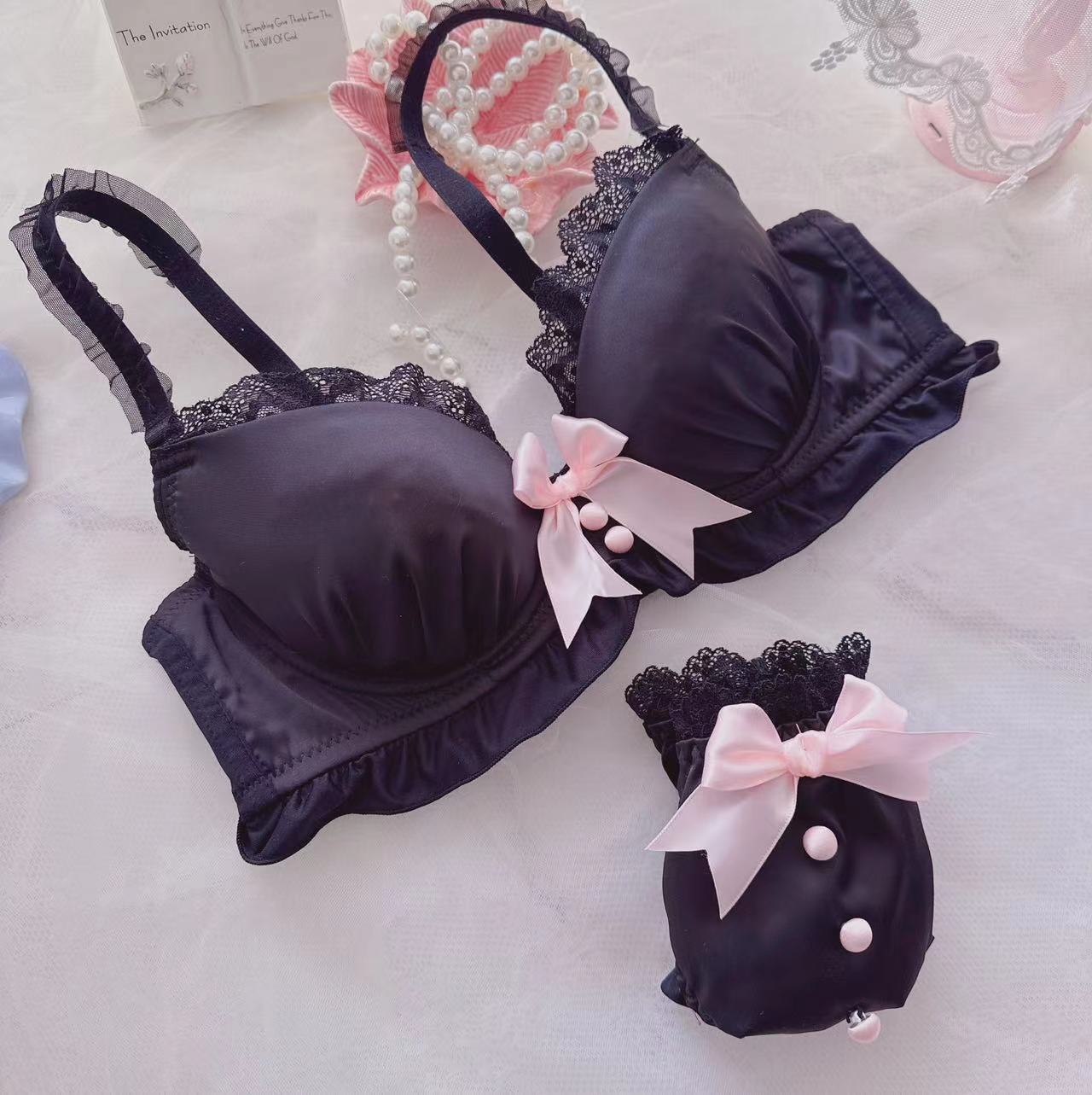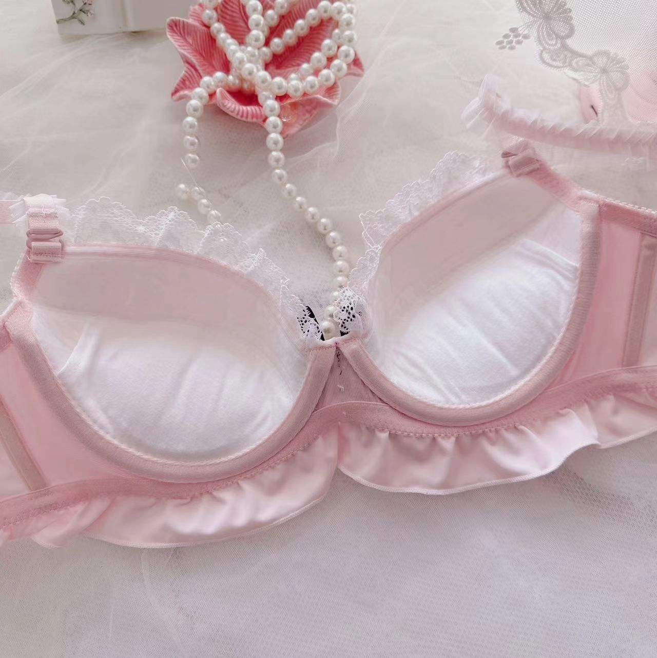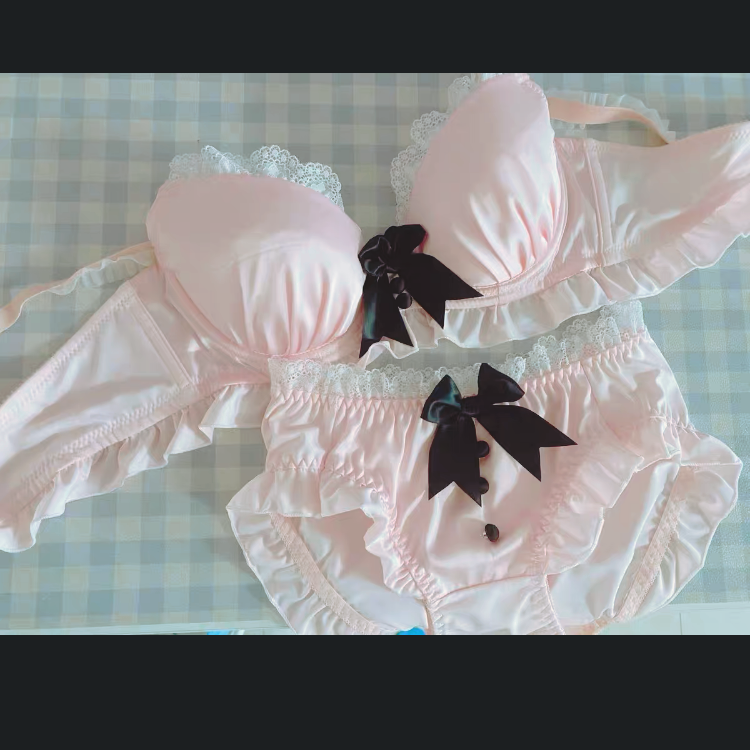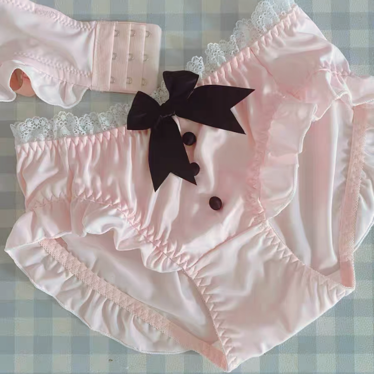 Girly Romantic Vintage Style Coquette Lingerie Set featuring bra with lace, bows, buttons and removable padded inserts, and matching satin bottoms with bows.