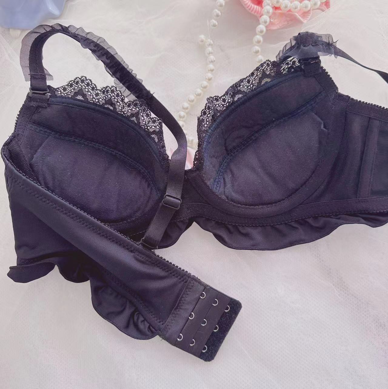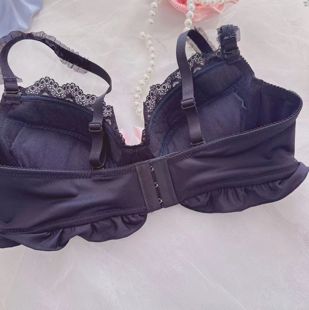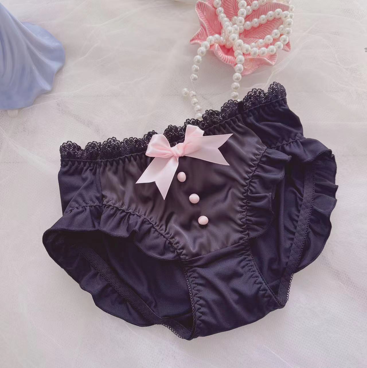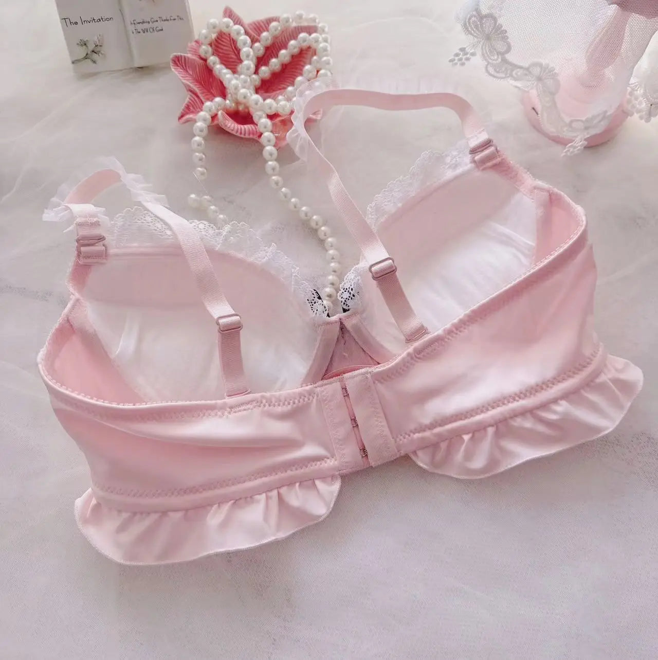Girly Romantic Vintage Style Coquette Lingerie Set featuring bra with lace, bows, buttons and removable padded inserts, and matching satin bottoms with bows.