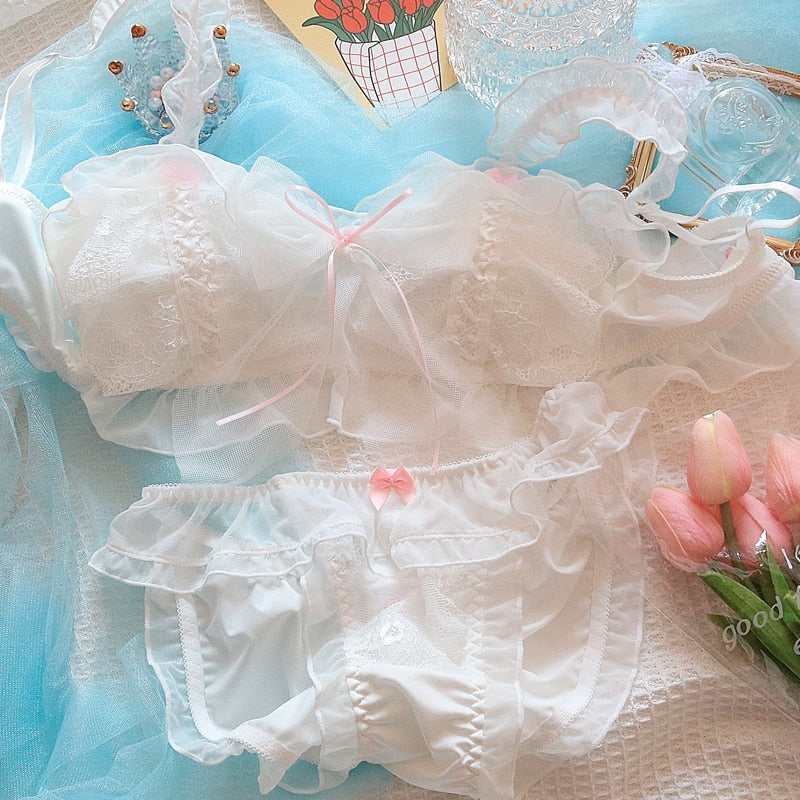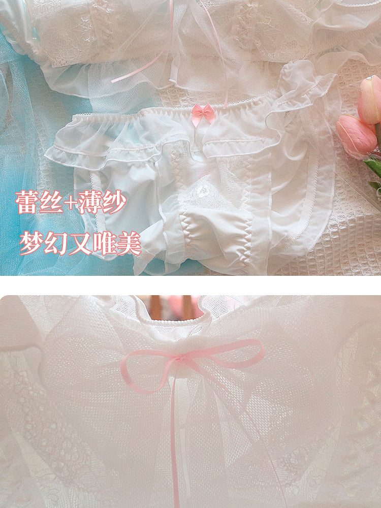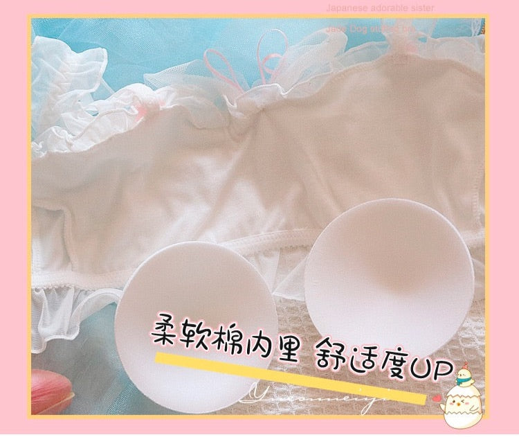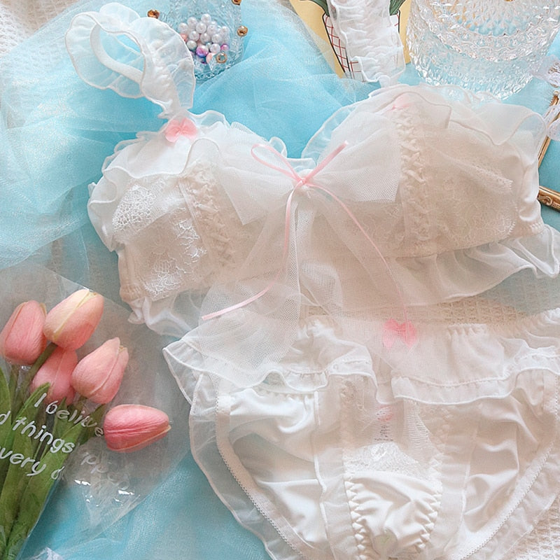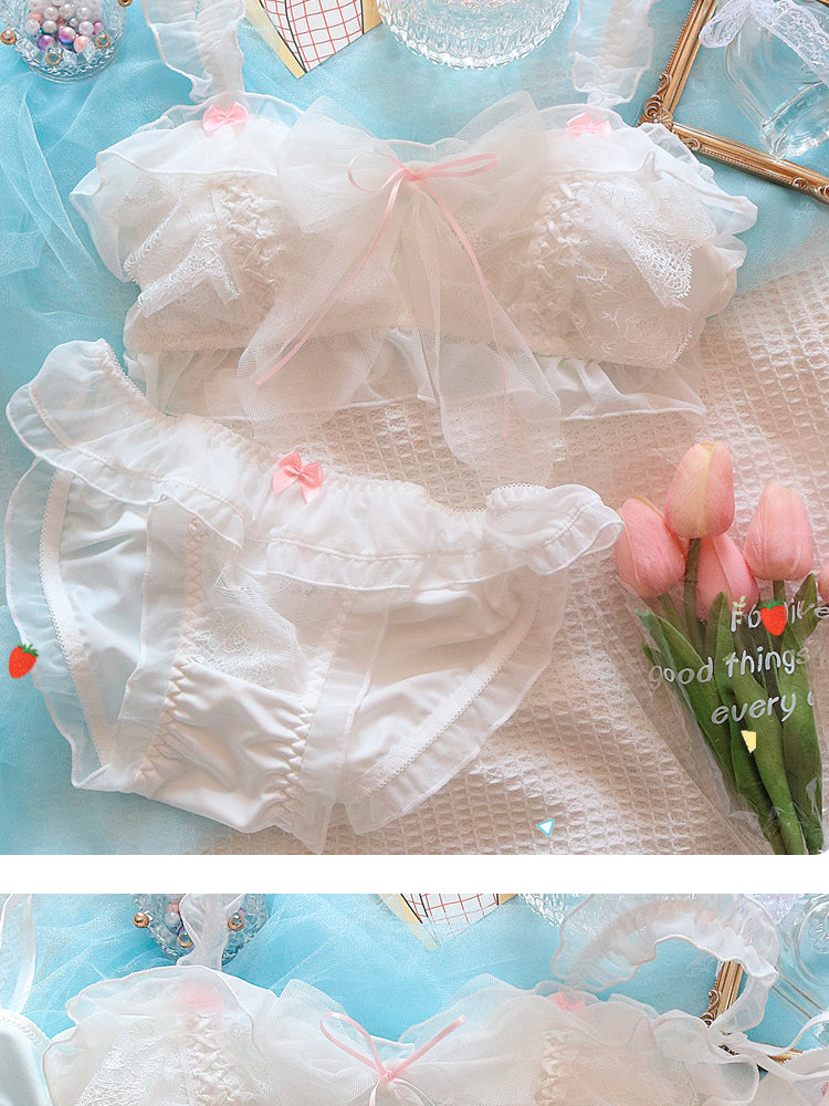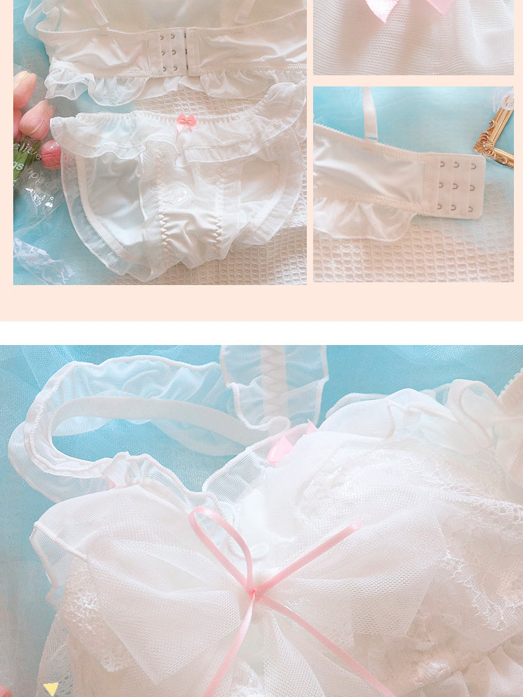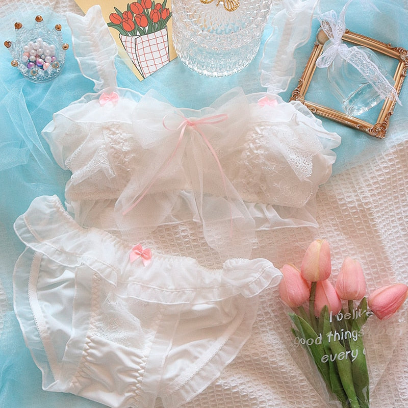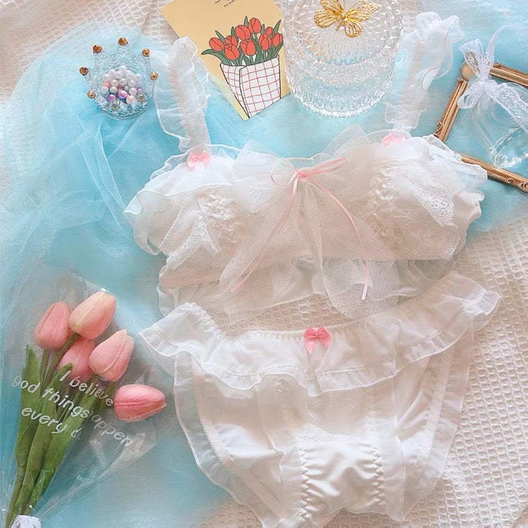 Sweet Girly Pink Bow Kawaii Princess Lolita Lingerie Set featuring wire-free bra with removable inserts, sweet pink bow decoration, tulle ruffles and matching bottoms.